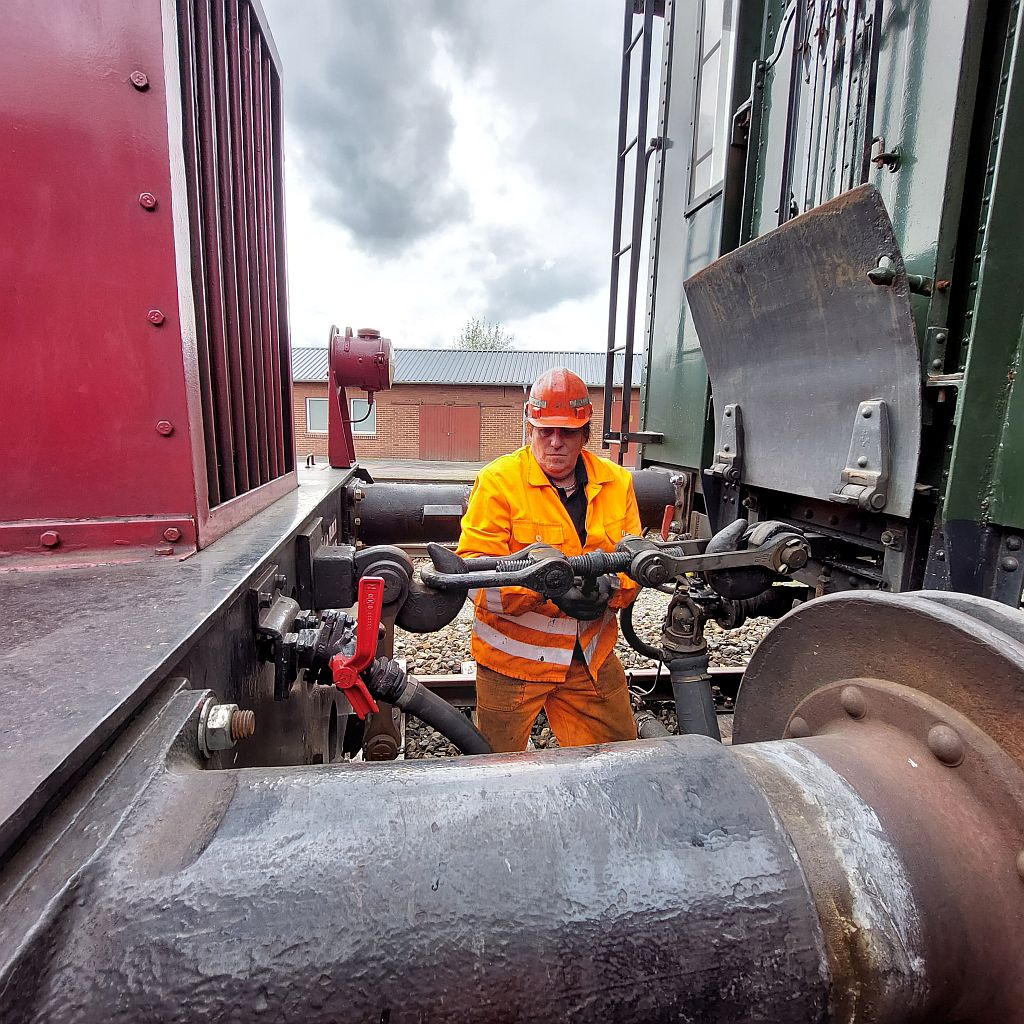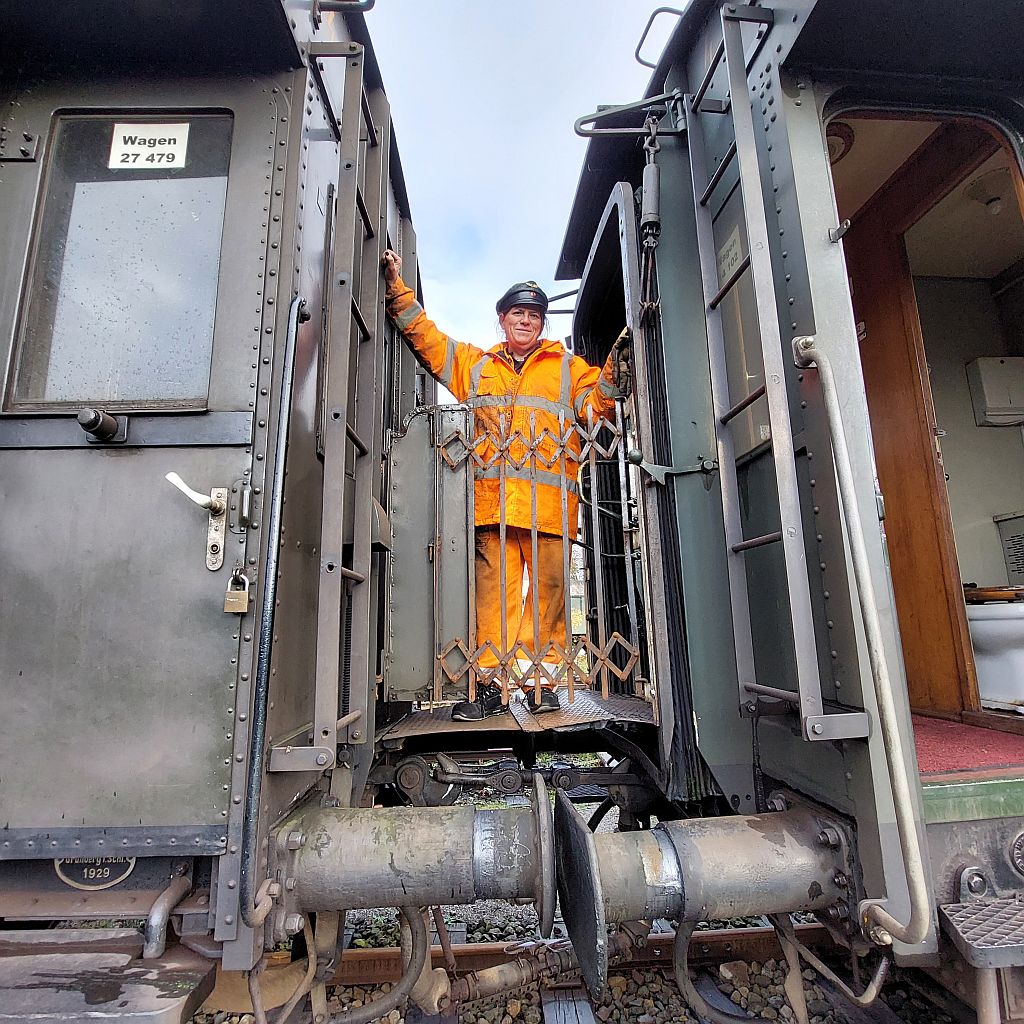 Claudia kuppelt alles; Faltenbalg, Scherengitter, Gummiwulst und auch die Dampfheizkupplungen
