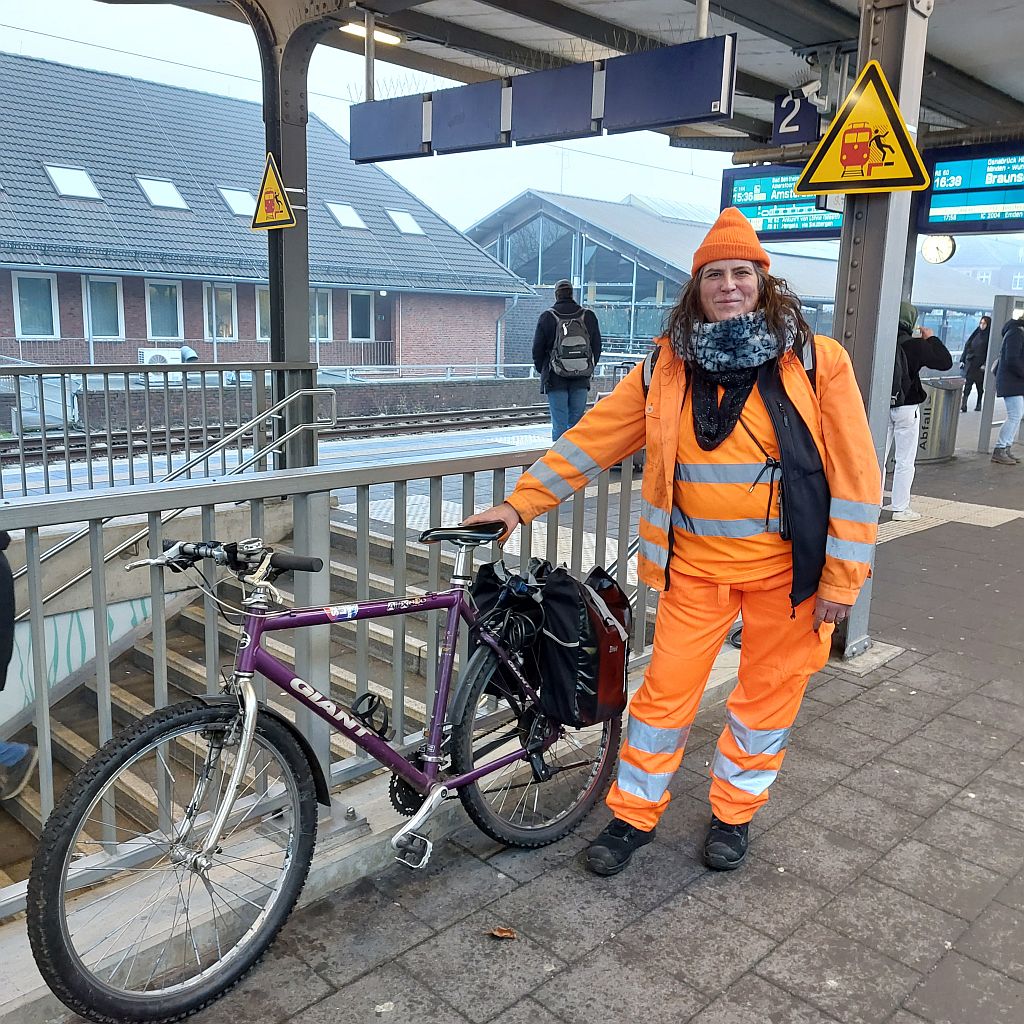 Mit Zug und Fahrrad ging es zur Praxisausbildung, im Zug natürlich mit sauberer Jacke...